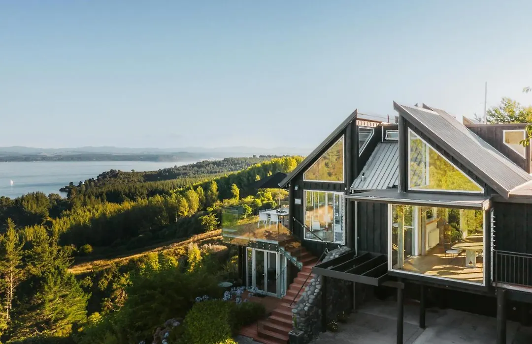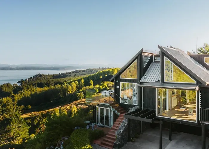 Acacia Cliffs Lodge, a luxury 5-star boutique accommodation rated 9.5/10 on Booking.com, offers panoramic views of Lake Taupo and Mount Tauhara. The lodge features four super king guest rooms, each with private decks, and provides a range of gourmet dining options and outdoor activities.