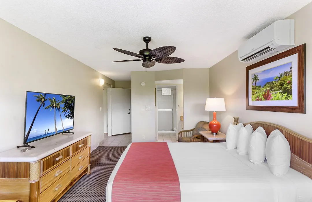 Accommodations at Maui Banyan Vacation Club include studio and one-bedroom suites, with options for up to six guests in two-bedroom Pearl units. Each unit features air conditioning, a kitchenette or full kitchen, private balcony, and modern appliances such as a dishwasher and coffee maker.