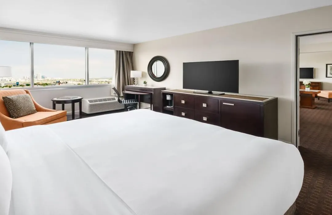 Guestrooms at Crowne Plaza Phoenix Airport feature upscale amenities such as refrigerators, ergonomic workspaces, and complimentary Wi-Fi. Options include rooms with either one king bed or two queen beds, with certain accommodations designed for accessibility. Guests can enjoy room service offering Southwestern cuisine delivered directly to their doors.