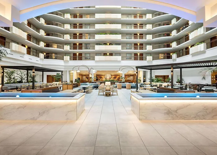 Embassy Suites By Hilton Anaheim South features a 14-story garden atrium with cascading waterfalls and koi ponds, offering a 4-star experience. With amenities including a free cooked-to-order breakfast, outdoor pool, and a pet-friendly policy, this hotel caters to both families and business travelers.