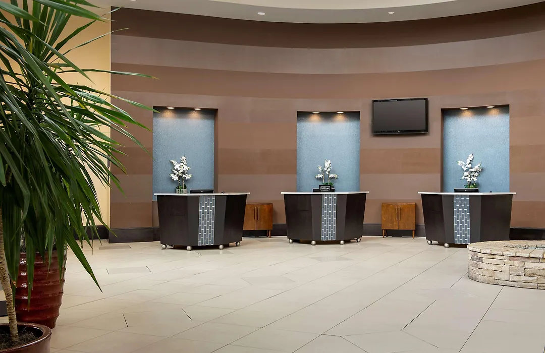 The Embassy Suites features 208 modern rooms with separate living areas, flat-screen TVs, and premium bedding. Suites include wet bars and microwaves, ensuring a comfortable stay for guests. The hotel is pet-friendly with designated pet-friendly rooms available.