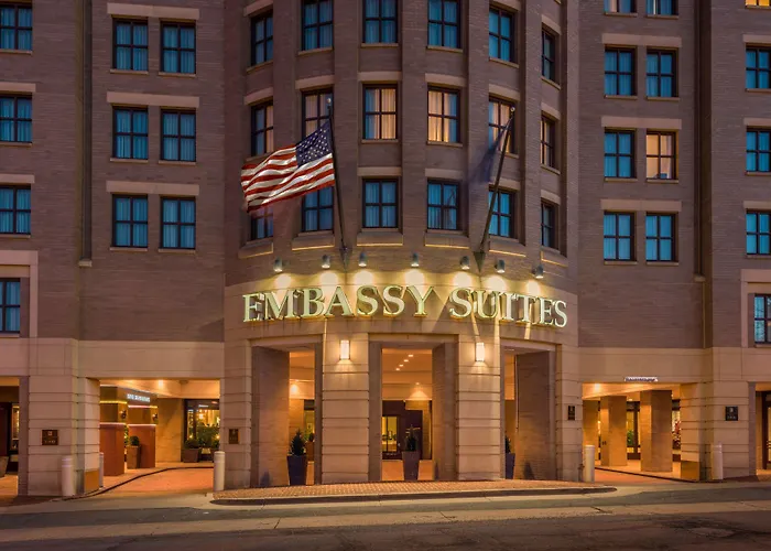 Embassy Suites By Hilton Alexandria Old Town is a 3-star hotel with an 8.6/10 rating, featuring an indoor pool, fitness center, and complimentary cooked-to-order breakfast. The hotel is pet-friendly and located in a historic area with convenient access to transportation.