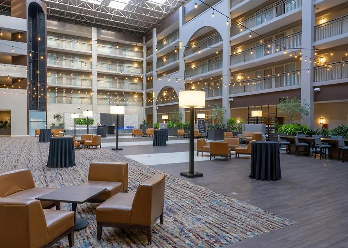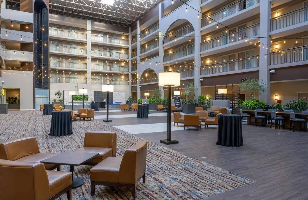The hotel features an indoor pool, fitness center, and a spa tub, catering to leisure activities. Embassy Suites also provides event spaces for up to 500 guests, equipped with necessary amenities for meetings and gatherings.