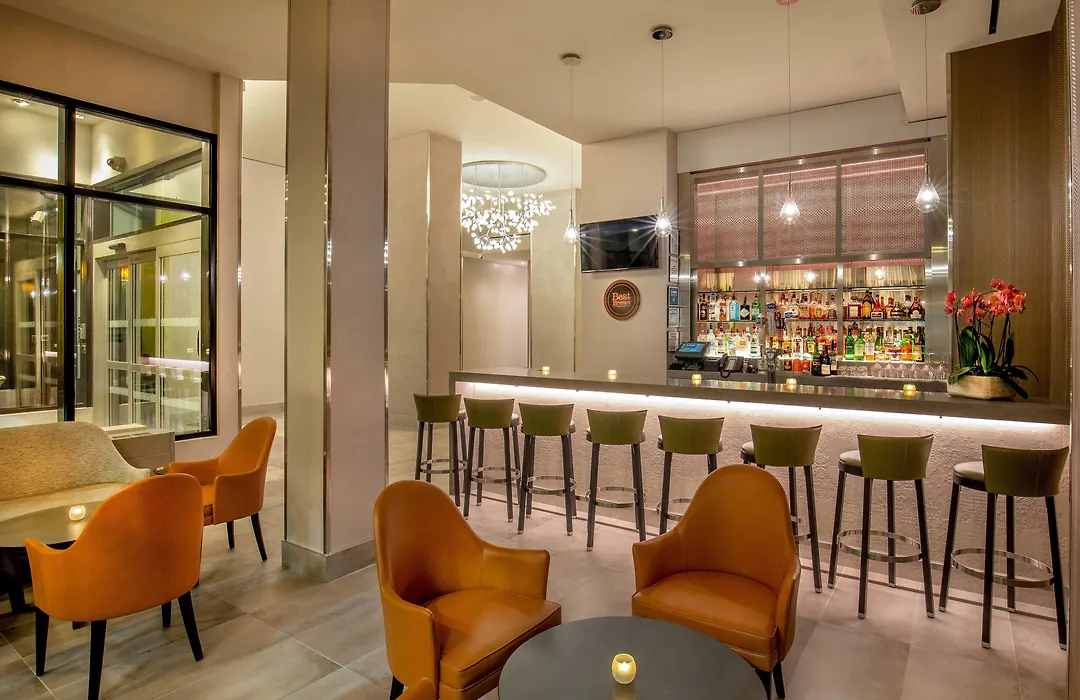 Dining is available at Gotham Bistro, where guests can enjoy seasonal dishes and traditional comfort food. The hotel also features a bar open during happy hour, serving a variety of beverages, including beer and wine.