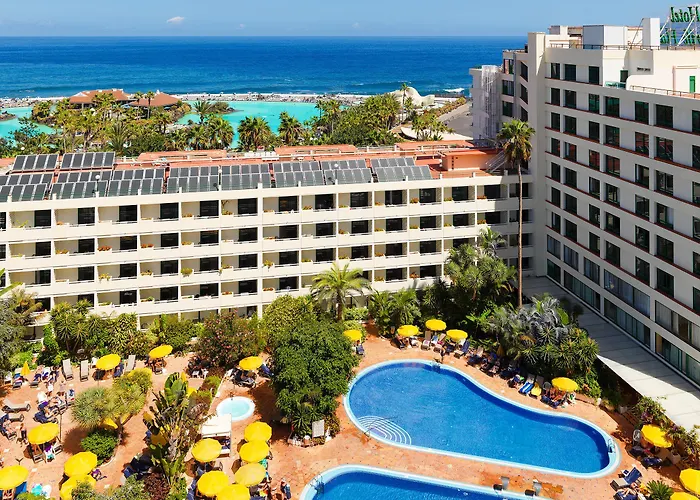 Leisure amenities include a complete entertainment program, a gym with sea views, and garden areas featuring Balinese beds. Guests can relax by the grand swimming pools or explore nearby attractions like Lake Martiánez and Loro Parque.