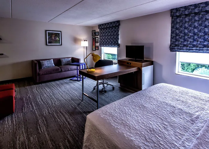 Rooms at Hampton Inn & Suites Staten Island include amenities such as air conditioning, free WiFi, and coffee facilities. Suites feature seating areas with a microwave and a refrigerator, providing a comfortable and functional space for longer stays.