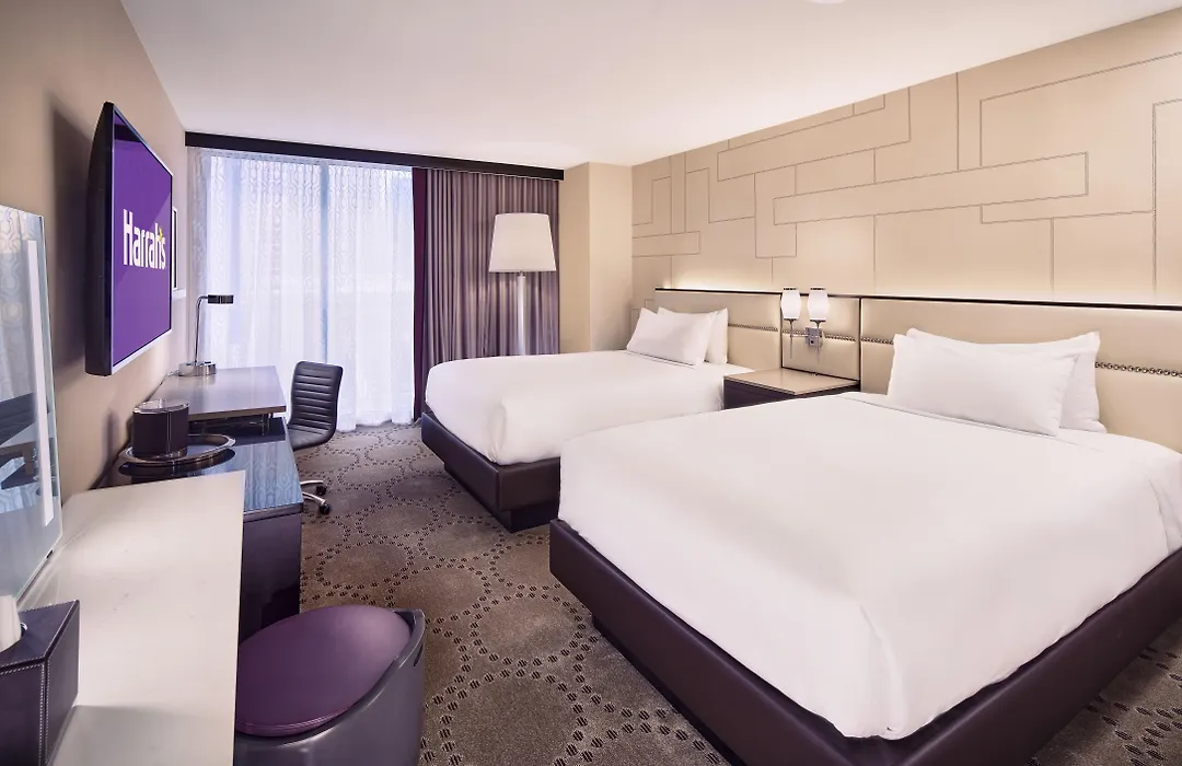 Rooms at Harrah's Las Vegas include amenities such as a 42-inch cable HDTV, seating areas, and marble bathrooms. Family-friendly accommodations feature rooms with two queen beds to accommodate children. Select rooms offer views of the Las Vegas Strip.