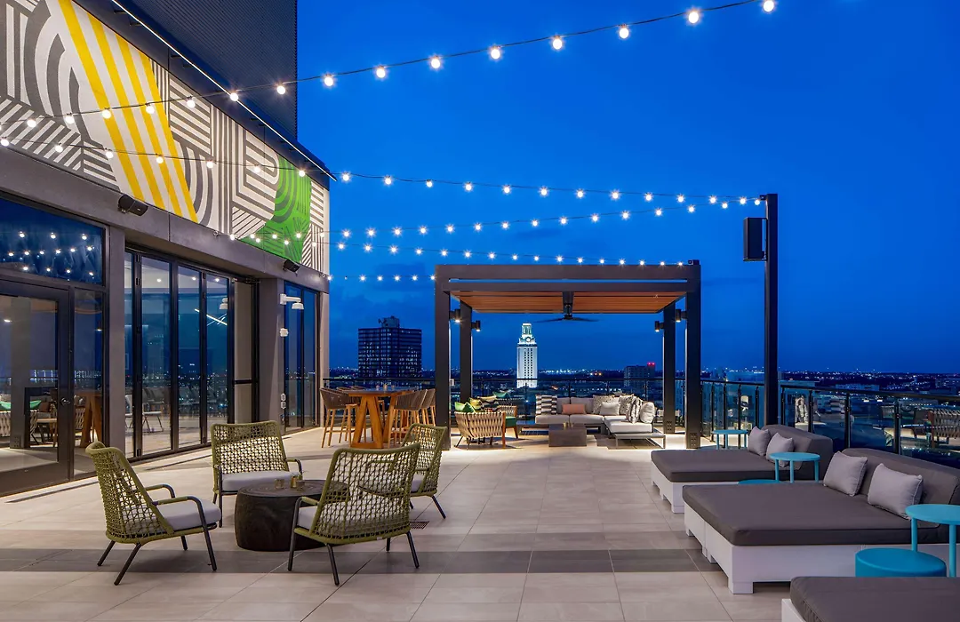 Hilton Garden Inn Austin University Capitol District, a 3-star Austin hotel rated 8.7/10 on Booking.com, features a fitness center, private parking, and a rooftop bar. The property offers a restaurant, room service, and complimentary WiFi.
