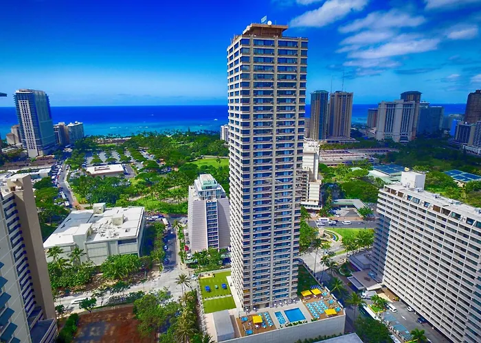Leisure options include an outdoor pool with cabanas and a fitness center fully equipped for workouts. Nearby attractions include Waikiki Beach, the Hawaii Convention Center, and families can enjoy the Honolulu Zoo or the Waikiki Aquarium, both 1 miles away.