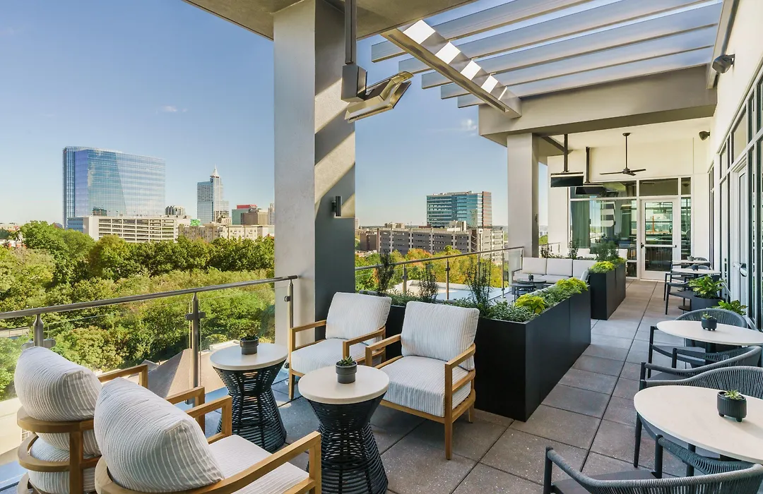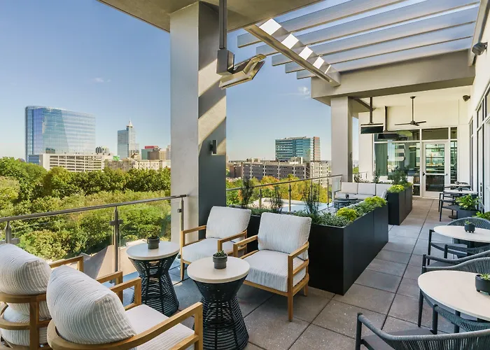 Dining options include a European-inspired breakfast and a rooftop bar serving tapas and wines overlooking the Raleigh skyline. Nearby restaurants include Char Grill and Tobacco Road Sports Cafe.