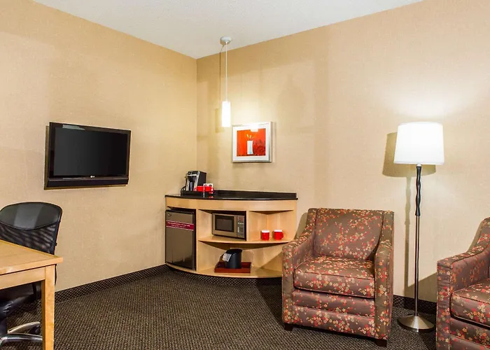 Rooms at Cambria Hotel feature modern amenities such as 32-inch LCD televisions, microwaves, and refrigerators. Private bathrooms are equipped with designer toiletries and hair dryers, ensuring convenience for guests.