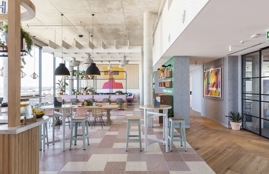 Dining options include a self-serve gourmet food shop with items like vegan salads and sushi. Guests can enjoy drinks in the plant-festooned bar that is also part of the colorful reception area.