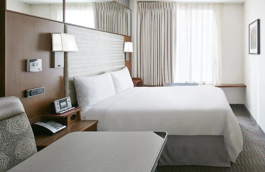 Rooms at Club Quarters Hotel Grand Central, New York feature modern design with amenities like flat-screen TVs and private bathrooms. Some suites include kitchenettes, providing options for extended stays. Guests can find a variety of dining options nearby, such as GRK Fresh Greek and Davio's Northern Italian Steakhouse, all within a 0.3 miles radius.