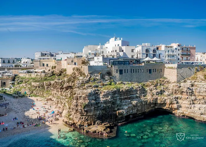 Covo Dei Saraceni, a 4-star Polignano a Mare hotel rated 8.4/10 on Booking.com, features rooms with Mediterranean design and a rooftop terrace with a swimming pool. Amenities include a spa offering wellness treatments and two meeting rooms accommodating up to 250 guests.