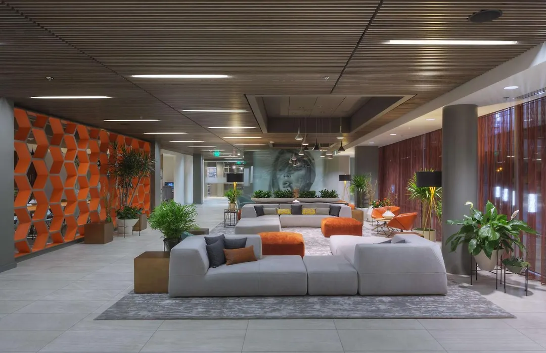 The hotel features 168 guest rooms and suites equipped with state-of-the-art technology, including HD TVs and USB charging ports. Rooms also include smart refrigerators, plush bedding, and spacious modern bathrooms with walk-in showers.