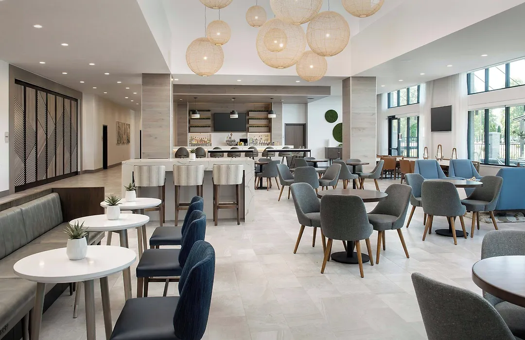 Guests can enjoy healthy dining options at the on-site restaurant, while a bar is available for drinks. A complimentary breakfast buffet is offered on weekdays from 6:00 AM to 9:00 AM and on weekends. Nearby dining options include Corner Bakery Cafe and Jersey Mike's Subs, both within 0.3 miles.