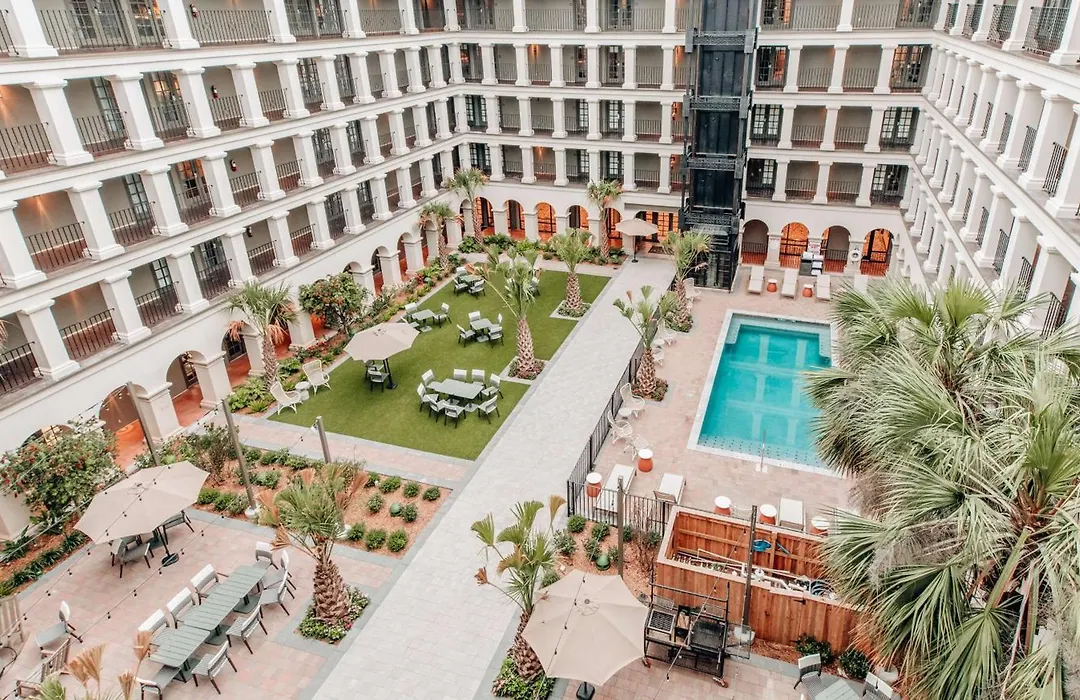 The hotel features a courtyard with an outdoor pool, hot tub, and fitness center. Business amenities include a complete business center and meeting rooms, accommodating various professional needs.