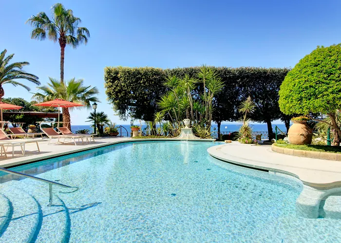 Grand Hotel Ambasciatori is a luxury 5-star hotel with a 9.4/10 rating, featuring a private beach, lush gardens, and stunning views of the Gulf of Naples and Mount Vesuvius. The hotel offers fine dining, a wellness center, swimming pools, and a range of elegant accommodations.