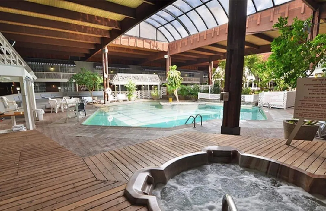 Dining options include on-site restaurants with weekend dining available. Guests can also relax by the lakeside fire pit or enjoy paddle boating on Cedar Pond, while the fitness center and heated indoor pool provide further recreational options.