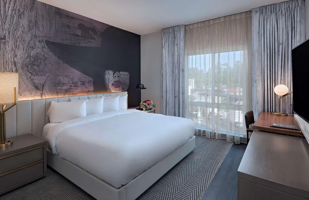 Rooms at Hyatt Centric The Woodlands feature premium bedding, flat-screen TVs, and laptop-compatible safes. Many rooms provide access to a communal terrace, offering views of the bustling Market Street below. Some accommodations also include a seating area, enhanced by thoughtful touches like air conditioning and minibars.