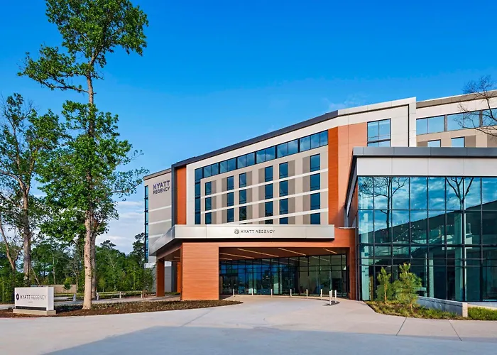 Hyatt Regency Conroe, rated 9.3/10 on Booking.com, features a restaurant with an expo kitchen, a market, and an outdoor pool. This 250-room hotel serves as a conference center and is designed to be a focal point in the community.