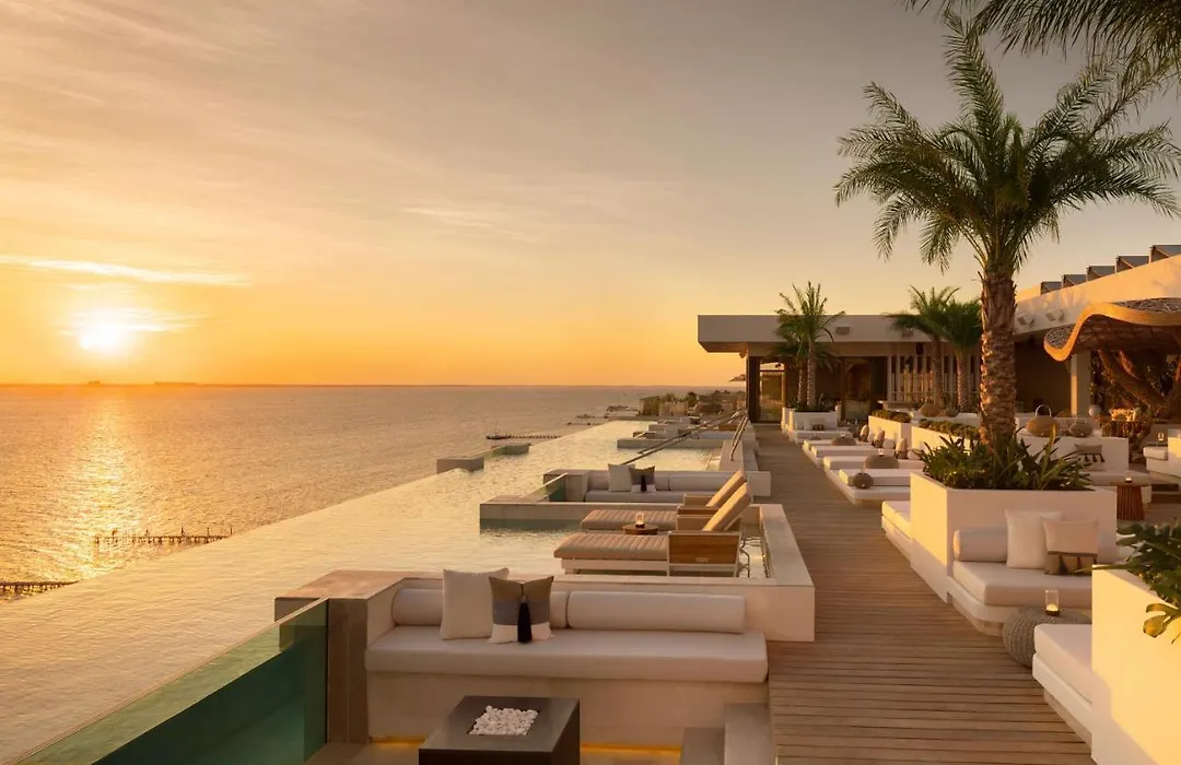 Impression Isla Mujeres By Secrets (Adults Only), a 5-star resort with a Booking.com rating of 9.1/10, offers luxurious suites with expansive ocean views and personalized butler service. Guests enjoy gourmet dining and an impressive outdoor pool while engaging in activities such as snorkeling and cycling.