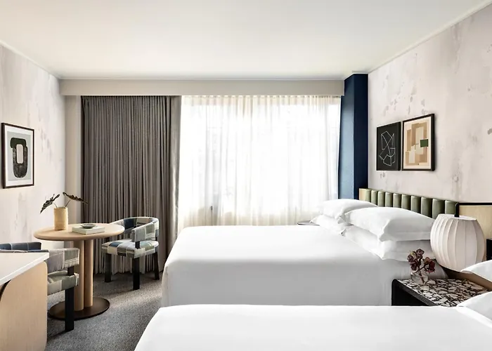 Rooms at Kimpton Theta feature oversized designs with modern amenities, including flat-screen TVs and free WiFi. The hotel offers a variety of room options catering to different guest preferences, all equipped with essential conveniences.