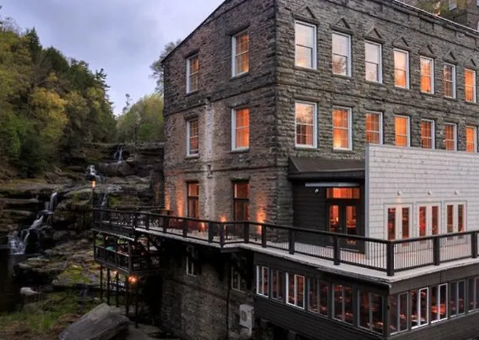 Ledges Hotel, a 3-star boutique hotel in Hawley, PA, offers a unique blend of historical charm and modern amenities. Guests can enjoy stunning views of the Paupack High Falls from a multi-tiered deck and dine at the on-site restaurant showcasing local artistry. The hotel also features eco-conscious design elements while providing access to outdoor activities in the Poconos.