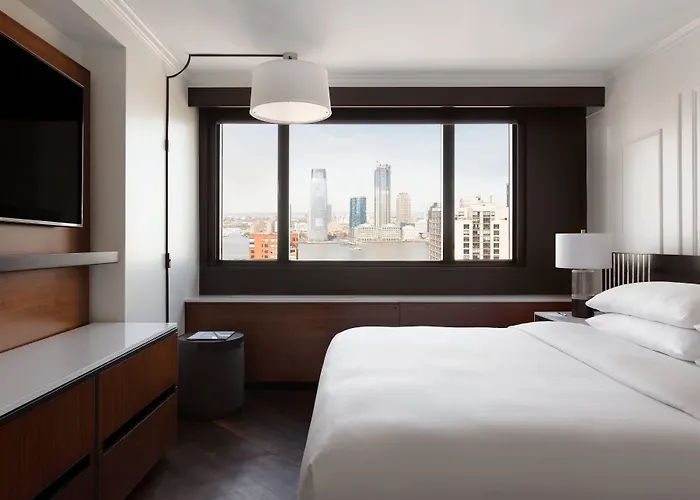 Rooms at New York Marriott Downtown feature flat-screen televisions, mini refrigerators, and marble bathrooms. Guests can expect signature Revive beds with down comforters and premium bed linens, ensuring a good night's sleep. Scenic views of New York Harbor are available in some accommodations.