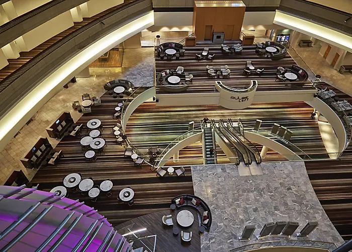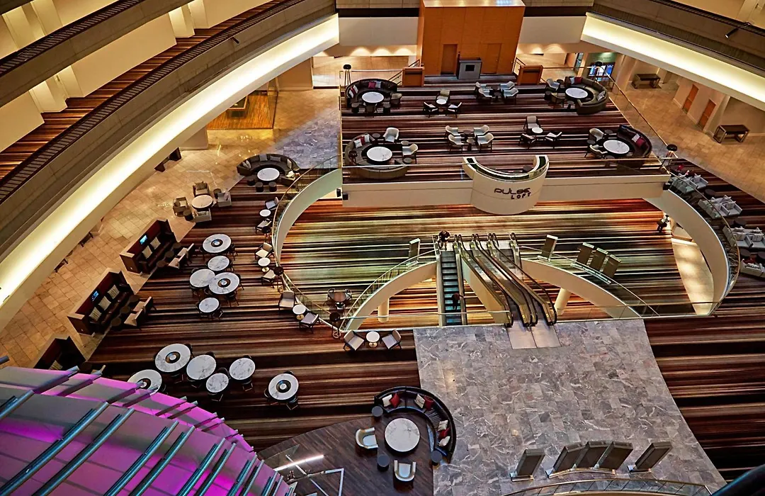High Velocity Restaurant and Bar serves pub fare and craft drinks in a vibrant sports bar setting with numerous HD TVs. The hotel also features the upscale Pulse Bar, offering creative cocktails in a chic environment, and an on-site Starbucks for coffee and light bites.