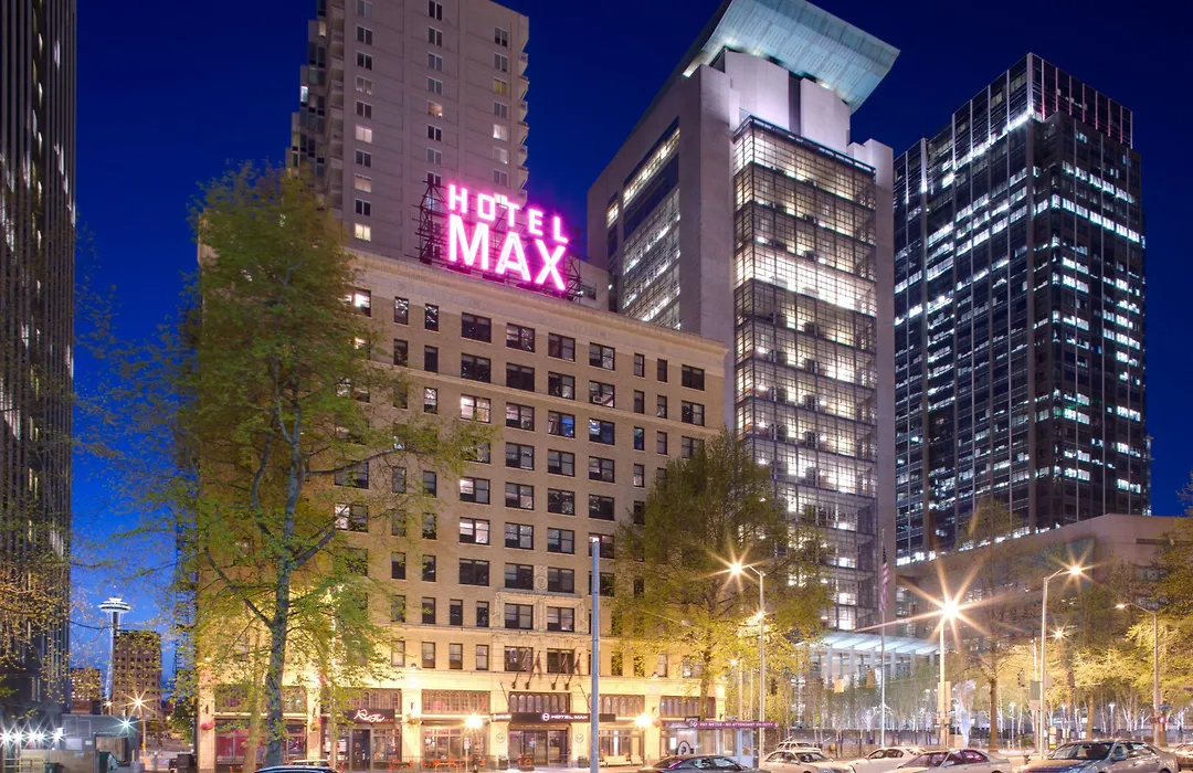 Hotel Max offers a boutique experience in downtown Seattle, showcasing art and music with playful amenities. This 3-star hotel features a craft beer hour, bike rentals, and a spiritual menu to enhance your stay. Guests can explore local culture, including the vibrant Pike Place Market.