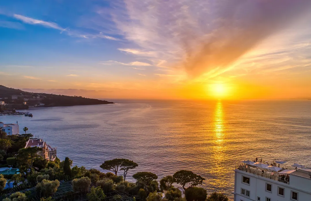 Hotel Mediterraneo, a 5-star boutique hotel with a 9.7/10 Booking.com rating, offers breathtaking views of the Gulf of Naples from its cliffside location in Sant'Agnello. Notable amenities include a rooftop Vista Sky Bar and direct access to La Marinella beach, making it ideal for guests seeking luxury and tranquility.