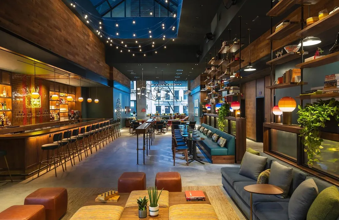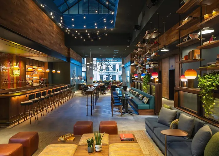 Moxy NYC Downtown offers a vibrant experience with its trendy design and engaging amenities. This 4-star hotel features a 5000-square-foot lounge with arcade games and a lively bar, catering to both leisure and business guests in a dynamic area.