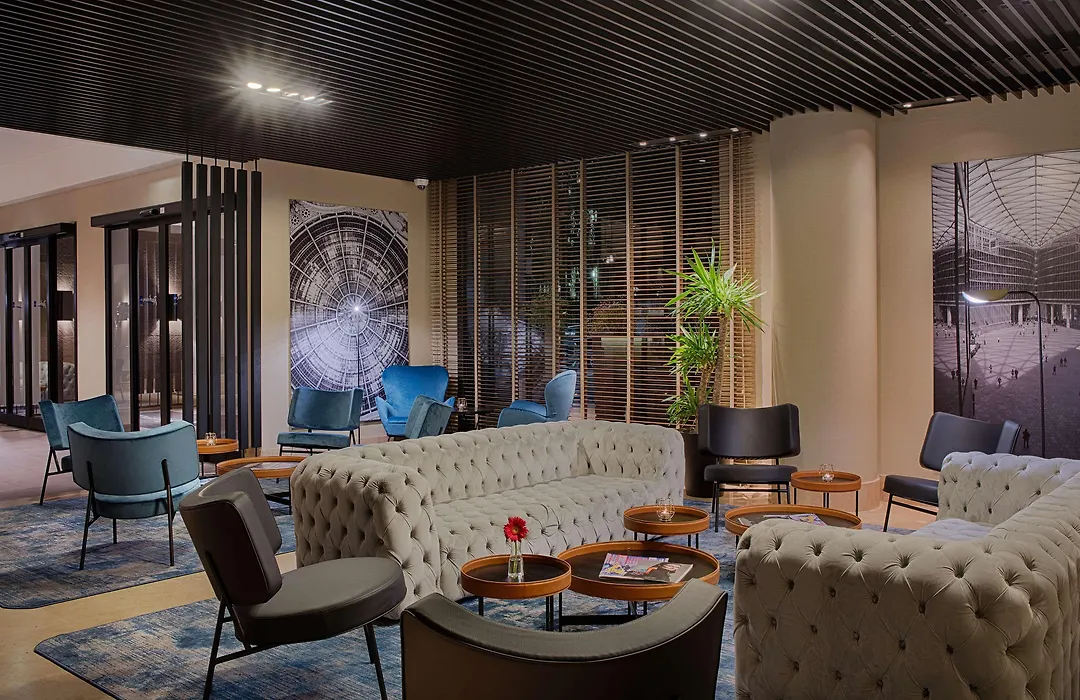 The Radisson Blu Hotel Milan offers 250 recently renovated rooms, featuring modern design and first-class comfort, including free high-speed Wi-Fi and smart 50" UHD TVs. Room types range from Standard Rooms of 323 ft² to the expansive Presidential Suite of 1614.5 ft², accommodating various guest needs, with some suites offering separate living areas.