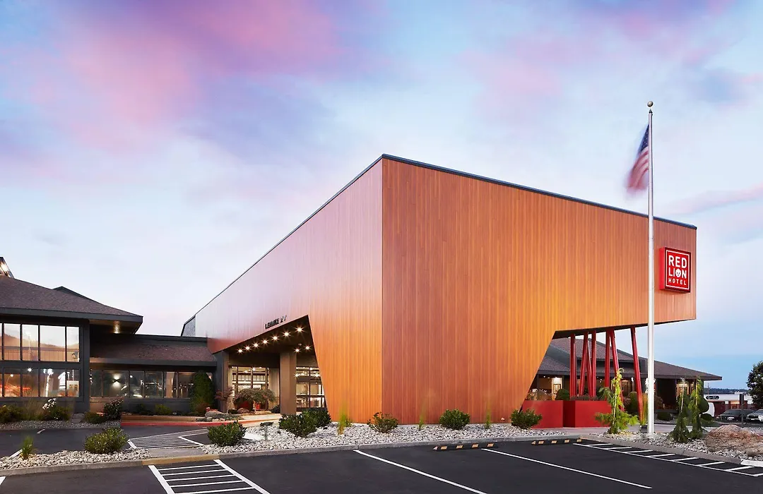 Red Lion Hotel features spacious guest rooms equipped with modern essentials, including a flat-screen TV, microwave, and mini-fridge. Some rooms offer a private balcony with views of the courtyard or pool area. Pet-friendly rooms are available for a nightly fee of $15.