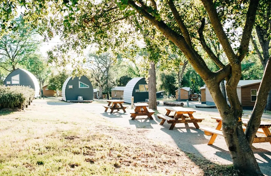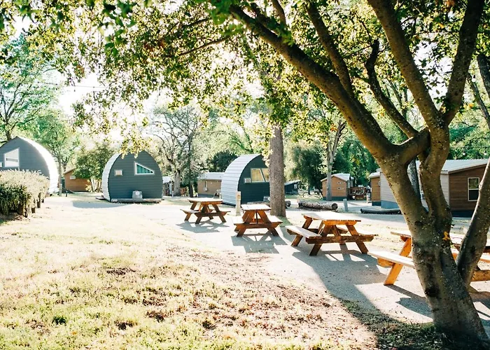 Sierra Meadows is a 3-star hotel rated 9.2/10 on Booking.com, transforming from a former golf course into a unique glamping resort. It features cabin accommodations, a swimming pool, and extensive outdoor space for activities with pets. The hotel is dog-friendly and provides complimentary bicycles for exploring the expansive grounds.