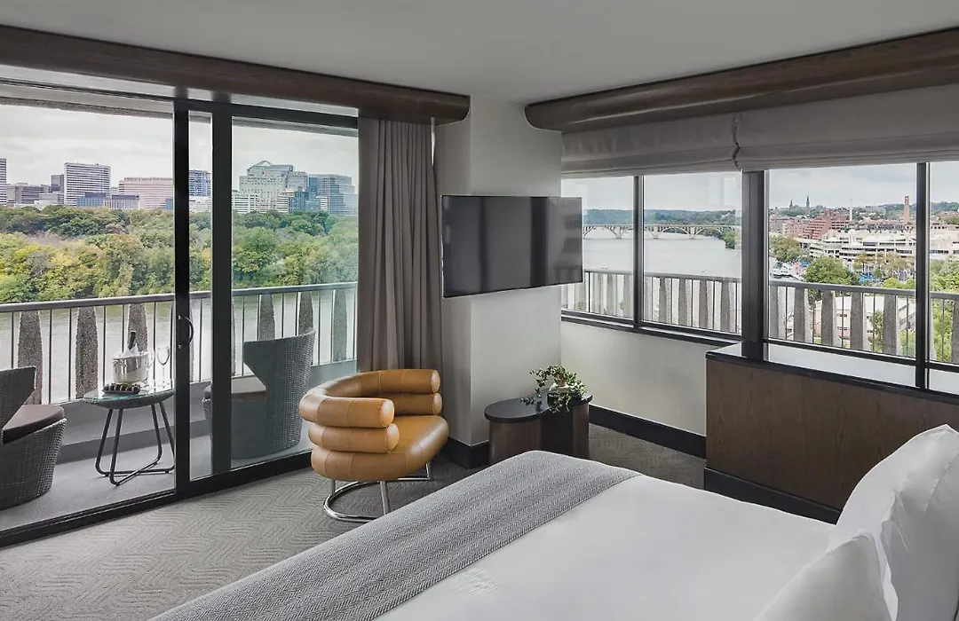 Rooms at The Watergate Hotel Georgetown feature modern design with plush bedding and sleek furniture. Options range from Superior and Deluxe rooms to expansive one- and two-bedroom suites, many of which include views of the Potomac River and custom bath amenities. All rooms come with flat-screen TVs, coffee machines, and private balconies.