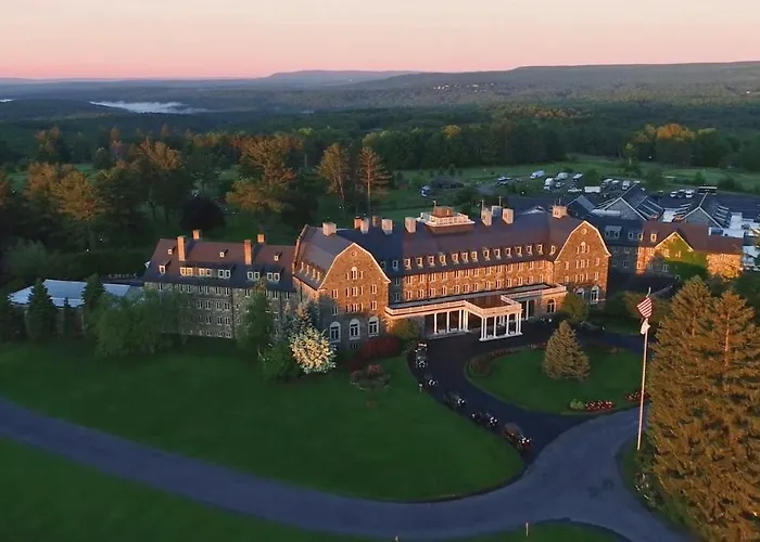 Skytop Lodge, rated 8.8/10 on Booking.com, is a 3-star family-friendly resort offering ample activities within a 5500-acre playground. Amenities include an indoor and outdoor pool, golf course, and various dining options featuring farm-to-table cuisine.