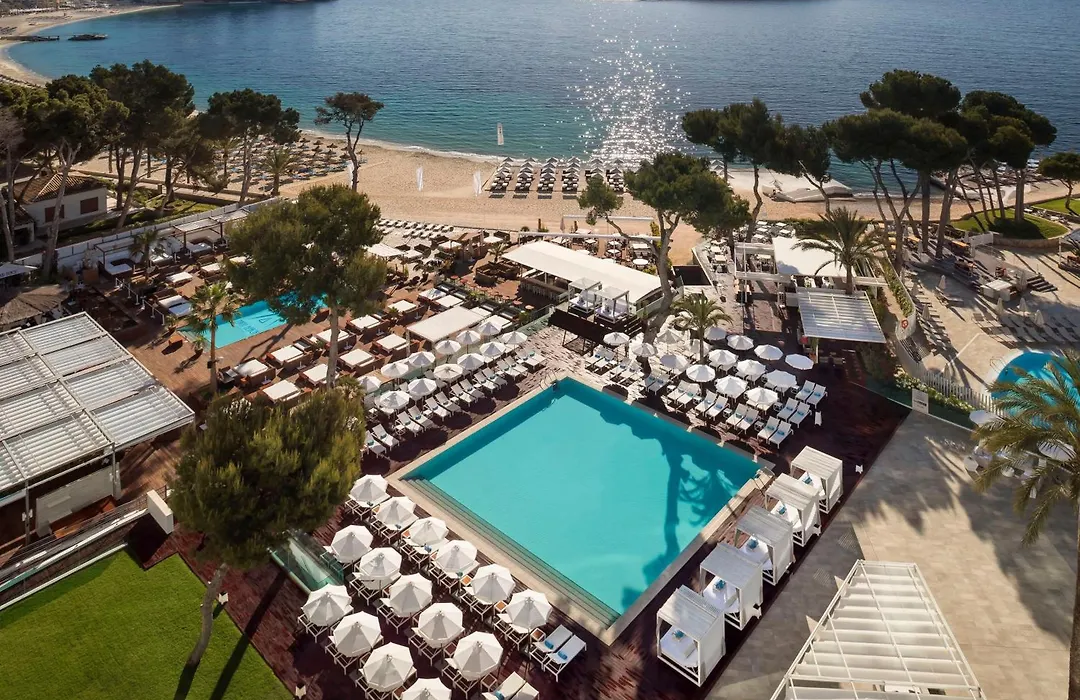 Melia South Beach, a four-star Magaluf (Mallorca) hotel rated 8.0/10 on Booking.com, features elegant accommodations alongside a stunning sandy beach with lush Mediterranean pines. Guests can enjoy amenities such as an outdoor pool, wellness center, and beachfront dining options.