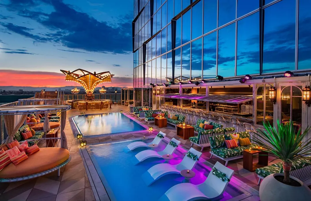 The outdoor swimming pool and four terraces overlook the Los Angeles skyline, offering an inviting space for leisure. Moxy Downtown Los Angeles also features a 24-hour front desk for guest assistance and information.