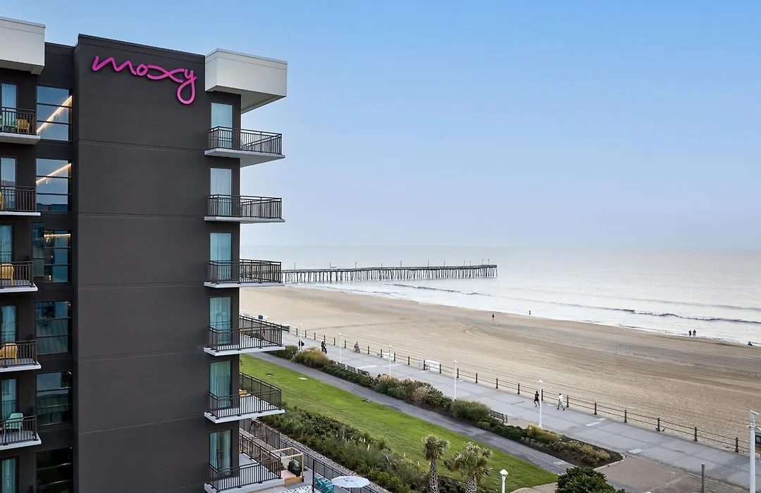 Rooms at Moxy Virginia Beach Oceanfront are designed to maximize space, featuring modern amenities such as flat-screen TVs with streaming services, balconies with sea views, and motion-activated LED guidelights. The hotel also accommodates pets, with a maximum weight limit of 50 lbs.