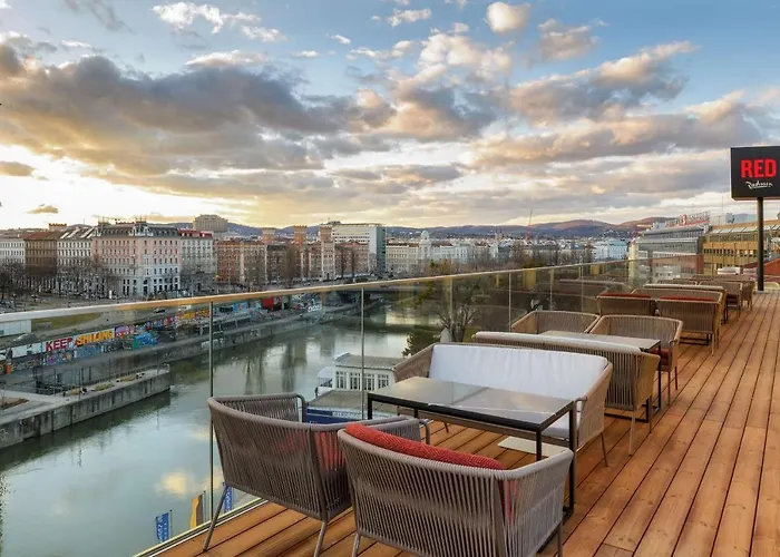 Radisson Red Hotel, Vienna is a 4-star hotel situated on the Danube Canal, featuring modern amenities including a fitness center, terrace, and stylish rooftop bar. Guests can enjoy Mediterranean, pizza, and international cuisine in the on-site restaurant and partake in a continental breakfast each morning.