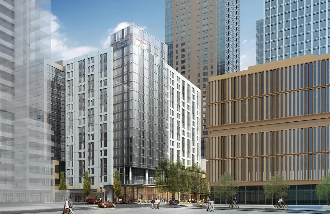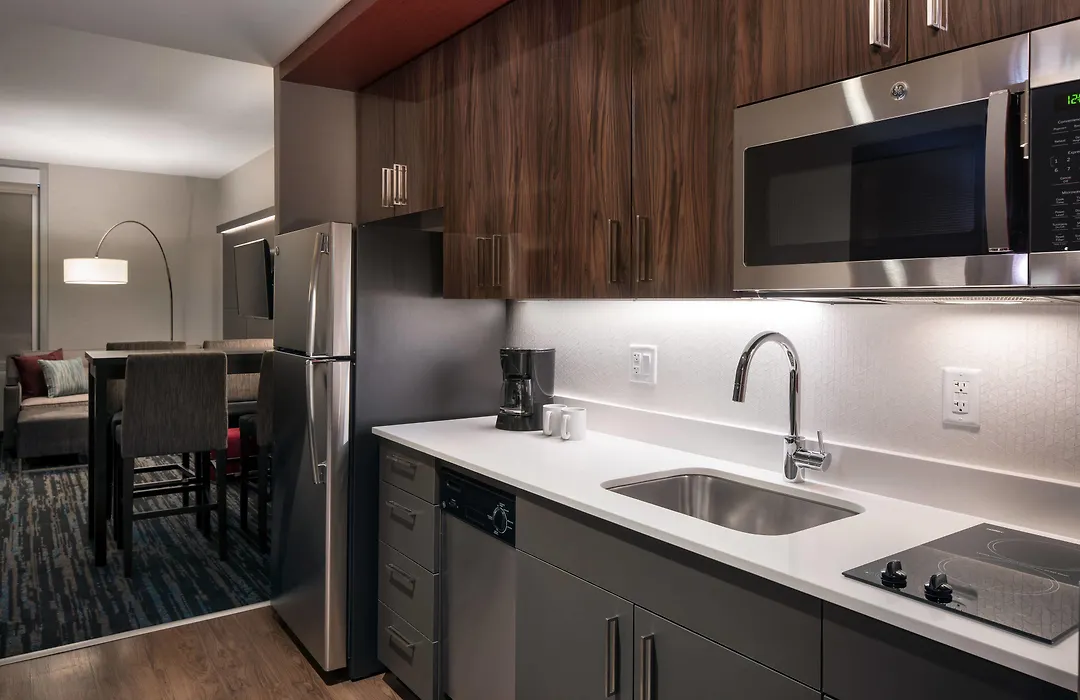 The hotel offers 302 air-conditioned rooms, each equipped with kitchenettes featuring full-sized refrigerators and stovetops. Guests can enjoy city views and streaming services on flat-screen TVs. Additional amenities include a work desk and a wardrobe.