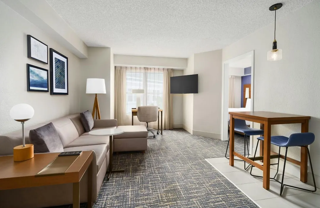 The Residence Inn features spacious suites designed for longer stays. Each suite includes a fully equipped kitchen, well-lit workspaces, and plush Marriott bedding. Some rooms come with additional living space and flat-screen TVs.