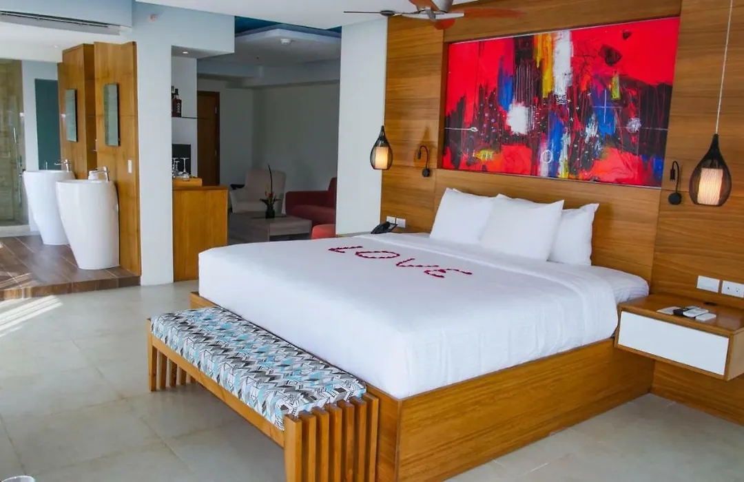 Rooms & Amenities have been carefully designed for comfort, with options such as Ocean View Jr Suites, Ocean Front Swim Up Jr Suites, and the Presidential Suite featuring a private pool and butler service. Each unit includes air conditioning, flat-screen TV, a private bathroom, and luxurious spa-inspired bath amenities.
