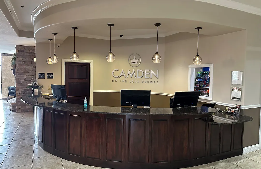 Accommodations at Camden On The Lake Resort include oversized suites equipped with a kitchenette, flat-screen TVs, and lake views from private balconies. The grand suite features a jetted tub and a living area, designed for comfort after a day on the water.