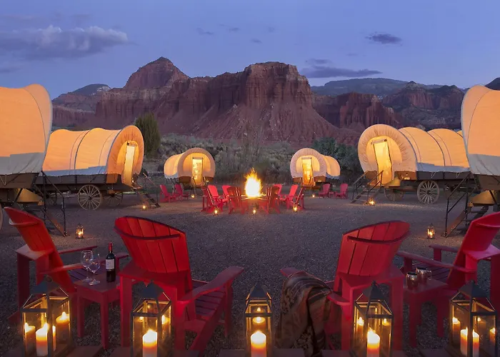 Capitol Reef Resort, a 3-star hotel rated 8.1/10 on Booking.com, offers unique lodging options including cabins, teepees, and Conestoga wagons, set against stunning views of the Red Rock Cliffs. The property features a heated outdoor pool and hot tub, free Wi-Fi, and the Pioneer Kitchen serving comfort food inspired by local landscapes.