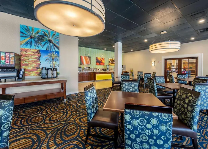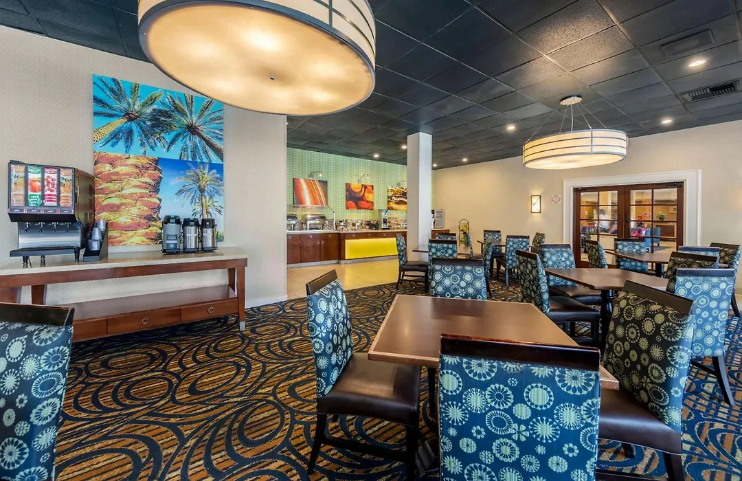 Dining options at the Clarion include the Palm Tree Café and Cantina Lounge, alongside a seasonal cabana bar. Nearby restaurants include Ruth's Chris Steak House and Slice Pizzeria, both within a 0.5 miles walk.