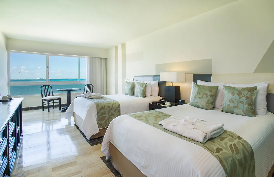 The resort features 436 elegantly decorated rooms, offering stunning views of the Caribbean Sea and Isla Mujeres. Each room includes a daily stocked minibar, a flat-screen TV, and iPod docking station.