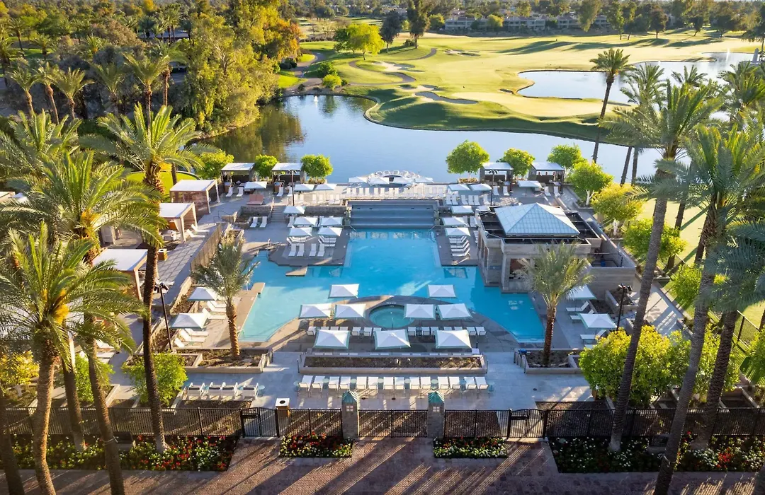 Grand Hyatt Scottsdale Resort, a 5-star property with an 8.1/10 Booking.com rating, features a 2.5-acre water playground with 10 interconnecting pools and a sand beach. The resort offers a full-service spa, multiple dining options, and luxurious accommodations with thoughtful amenities.